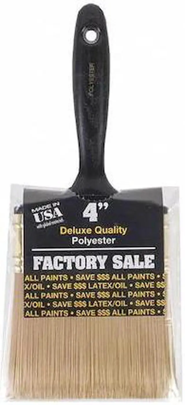 Paint Brush, Brush Style Wall, Filament Type Synthetic, Filament Material Polyester, Brush Size 4 in, Bristle Thickness 7/8 in, Bristle Length 3 7/16 in, Bristle Stiffness Firm, Handle Type Beavertail, Basic Handle Material Plastic, For Paint or Coating Type All Paints and Coatings, Surface Material Brick, Concrete, Drywall, Metal, Wood, For Paint Base Type Oil, Water, Surface Texture Medium, Smooth, Bristle Color Gold, Bristle Width 4 in, Brush Length 3 7/16 in