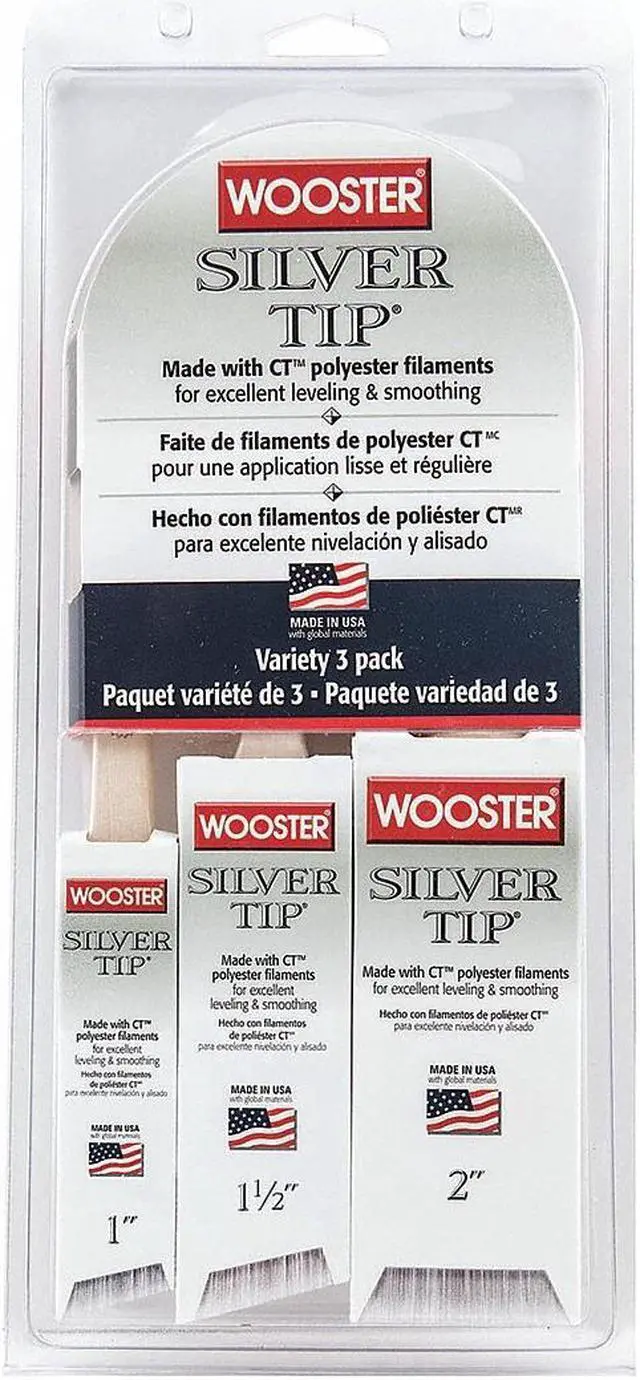 Paint Brush Set, Brush Style Angle Sash, Filament Type Synthetic, Filament Material Polyester, Brush Size 1 1/2 in, 1 in, 2 in, Bristle Thickness 5/16 in, 1/2 in, 9/16 in, Bristle Length 2 3/16 in, 2 7/16 in, 2 11/16 in, Bristle Stiffness Soft, Handle Type Beavertail, Sash, Basic Handle Material Wood, For Paint or Coating Type Enamels, Polyurethane Coatings, Varnishes, Surface Material Brick, Concrete, Drywall, Metal, Wood, For Paint Base Type Oil, Water, Surface Texture Medium, Smooth