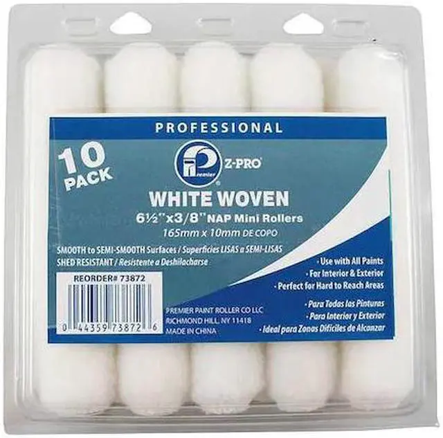 Mini Paint Roller, Cover Type Standard, Surface Texture Semi-Smooth, Compatible Roller Frame Style Wire, 6 1/2 in Overall Length, 3/8 in Nap Size, Surface Material Drywall, Paint Type All Paints, Core Diameter 5/8 in, Cover Material Woven Fabric, Core Material Plastic, Package Quantity 10. This item has been restricted from sale in the following state (s): []