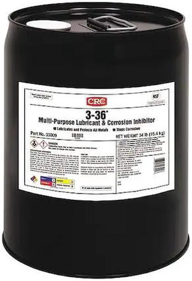 General Purpose Lubricant, Wet, CRC, 3-36, Net Fill 5 gal, Container Size 5 gal, Lubricant Container Pail, Petroleum Distillates, No Additives Primary Additive, Min. Operating Temp. -50 Degrees F, Max. Operating Temp. 250 Degrees F, NSF Rating H2 No Food Contact, 50 State VOC Compliant Yes, VOC Content 0 Percent, Lubricant Color Blue/Green, Odorless No, Flammable Flammability, Combustible Liquid (Category 4), Flash Point 192 Degrees F, Standards NSF Registered 017429, Category Code H2. This item has been restricted from sale in the following state (s): []