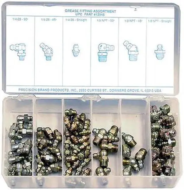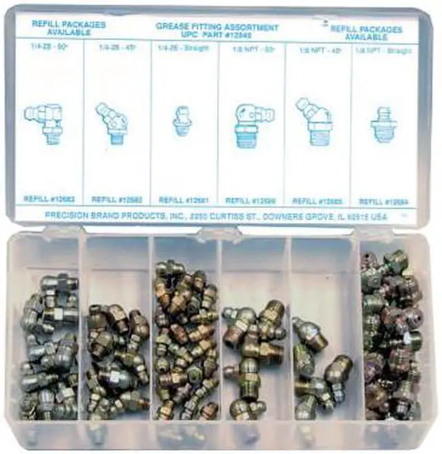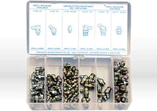 Precision Brand Precision Brand Grease Fitting Assortments Built-in ball, under spring pressure, prevents dirt from entering. Handy kit for shop tool room or toolbox. Plastic compartment box is easy to store. Push type, plated fittings permit lubricant to flow Pack of 1