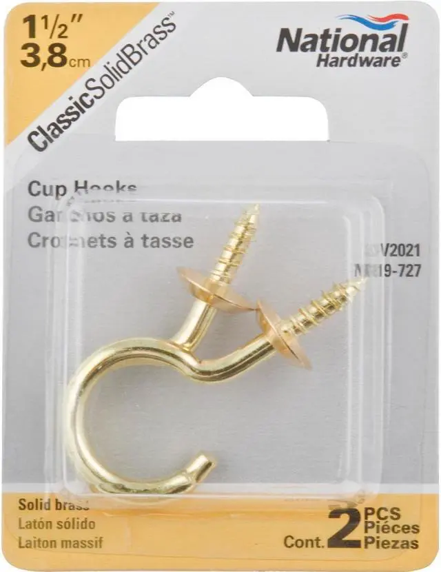 Catalog model No. V2021 series. Solid brass cup hooks are designed for hanging home and industrial products. Solid brass construction for maximum corrosion protection. Easy installation. Sharp screw point bites into wood easily and quickly. For interior and exterior applications.