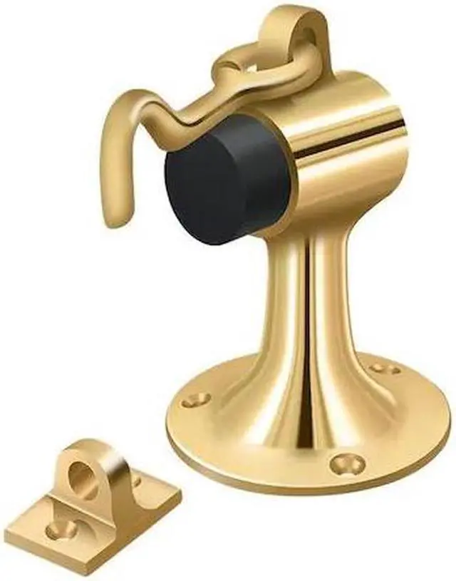 Includes bumper with matching screws. Floor mounted bumper. Solid brass. Pictured in Satin Nickel.