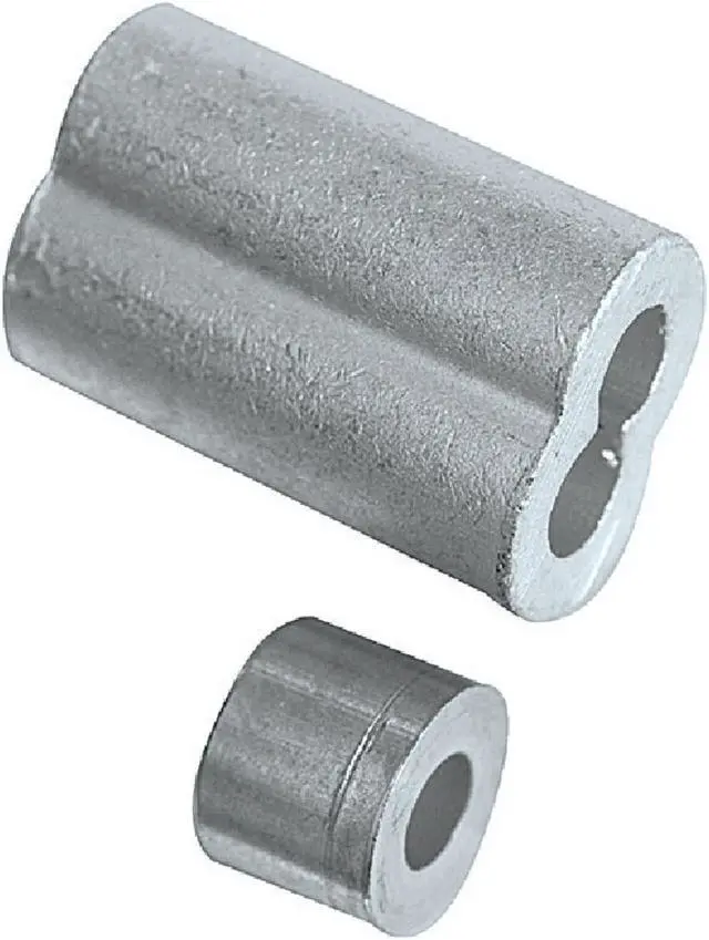 Designed to make strong wire rope loops. 2 ferrules and 2 stops per card. Just set with a hammer. Aluminum. Number of Pieces: 4 Pcs. Material: Extruded Aluminum Size: 3/16 In.