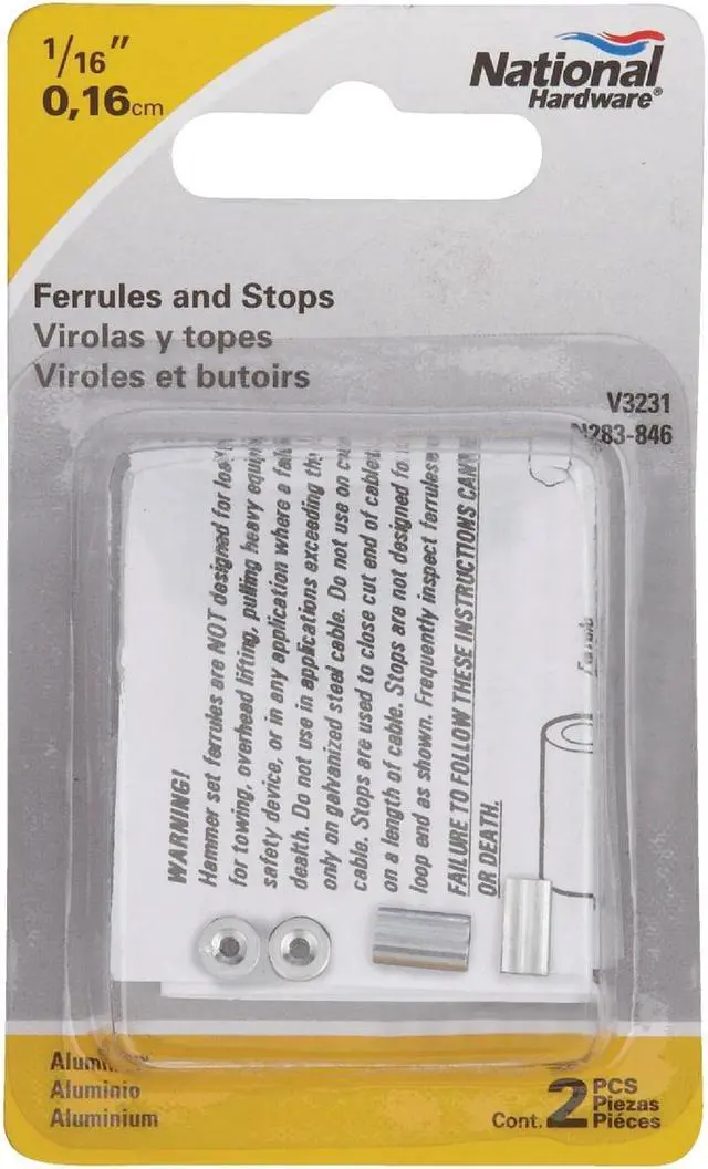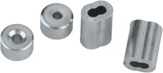 Designed to make strong wire rope loops. 2 ferrules and 2 stops per card. Just set with a hammer. Aluminum. Number of Pieces: 4 Pcs. Material: Extruded Aluminum Size: 1/16 In.