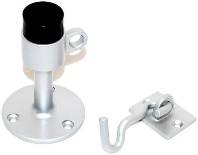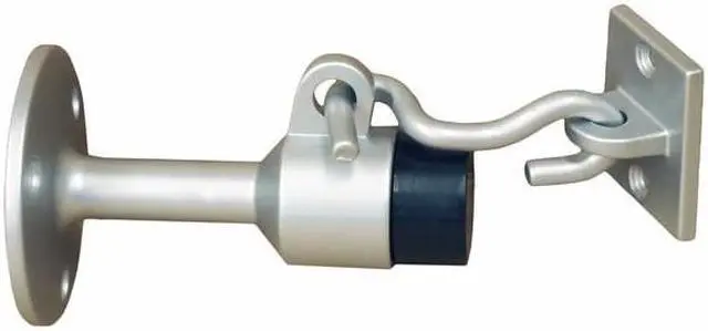 Ultra Hardware 71024 Aluminum Heavy Duty Angle Wall Mount Door Stop With Hook & Plate Door Holder, Price is given per Door Stop, Door Stop Size: 3-1/2" Projection; Finish: Satin Aluminum; Material: Cast Aluminum; 2-1/2" Base Plate 3 Hole surface mount Furnished with spindle, keeper, and screws.