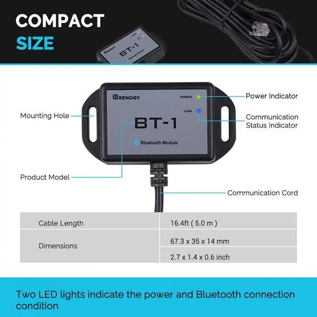The Renogy BT-1 Bluetooth Module (New Version) pairs great with any compatible Renogy solar charge controller. This updated model boasts an increased signal range of up to 82 feet and an additional LED to indicate when your devices have synced. Plug the BT-1 into your controller's RJ12 port to seamlessly monitor and change settings straight from your smart device through the DC Home App (available in both the App Store and Google Play).