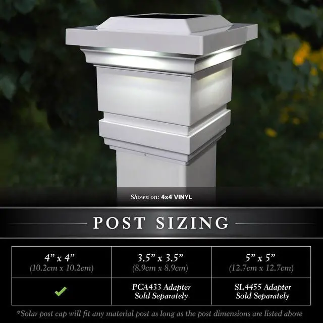 2 long life AA Ni-MH rechargeable batteries included^^Manufactured from durable Tan PVC (Vinyl) wont fade or yellow^^Will fit over an actual 4x4 post^^Quick and easy Do It Yourself installation. ^^15 Lumens / 4500 5500