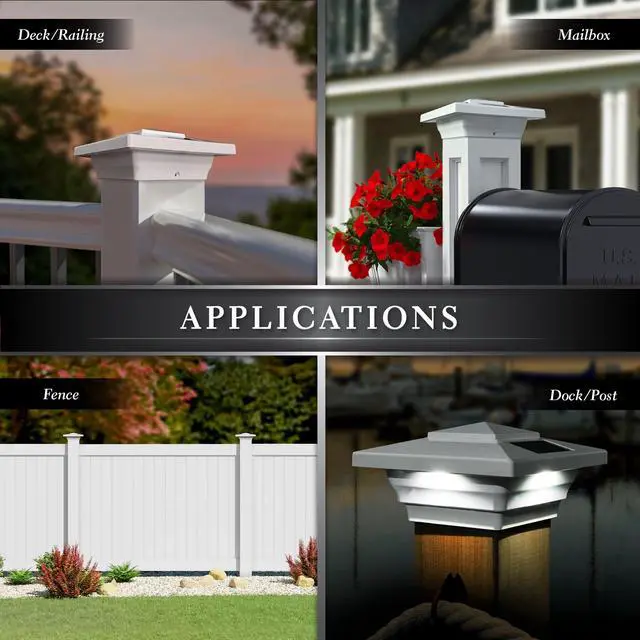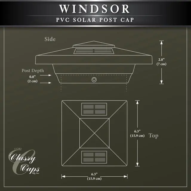 Our low profile 4"x 4" Windsor Vinyl solar post cap includes four high output surface mount LED's that are hidden from view, but as night falls this one of a kind patented design casts an array of light onto all four walls of the post cap and surrounding area... a truly exceptional style only from Classy Caps Mfg. Will fit over an actual 4x4 OR 3.5X 3.5 post. ( 3.5X 3.5 adaptor included. )