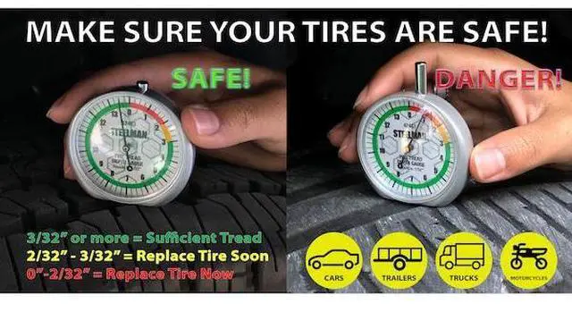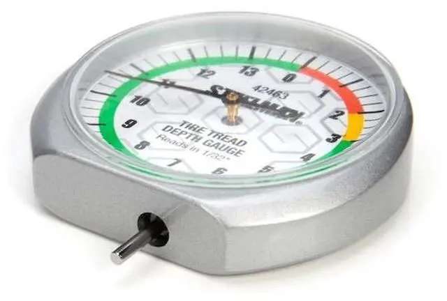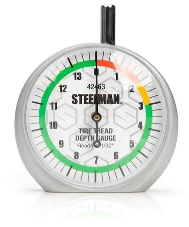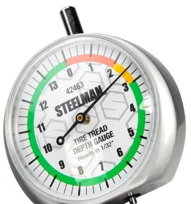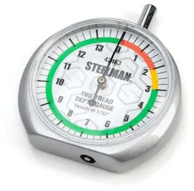 California Proposition 65: This product contains a chemical known to the State of California to cause birth defects or other reproductive harm. If you sell or service tires, or just try to take the best possible care of your personal vehicle, then you know the importance of having enough tread for safe driving. With the STEELMAN, youll be able to easily identify how much tread depth is left on each tire. For quick visual checks, the measurements are separated into green, yellow, and red to indicate tires that are good, showing wear, and or in need of replacing. For ease of use, the tool is marked with both labelled 1/32-inch increments and smaller, unlabeled 1/128-inch markings to provide high accuracy readings. The green range on the dial face highlights depths of is 3/32 and up, the yellow range shows 2/32 - 3/32, and the red range shows 0 - 2/32. Thanks to its simple, springless design this tool is great for use checking deep set wheels where it isn't easy to get direct line of sight like sports cars with tight wheel wells, dualie trucks, and big rigs.