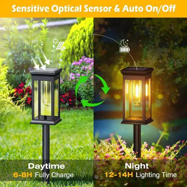 - Auto On/Off Light:Come with sensitive optical sensor,this solar stake light is capable to achieve auto off during the day and auto on at night. Warm yellow light creates cozy atmosphere and brightens your way home.