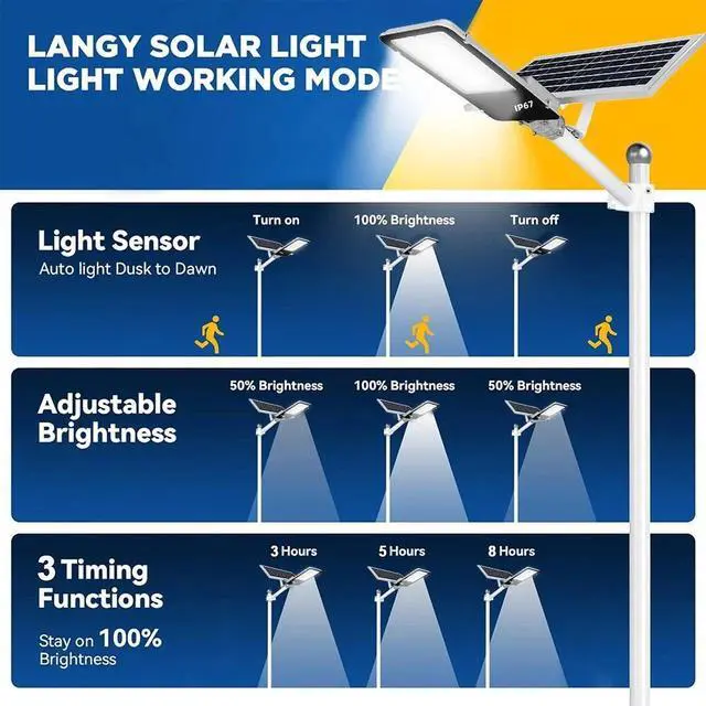 Two Control Methods: This solar LED street light is remotely controlled by a remote control, allowing you to use it within a range of 10-16 feet (approximately 3-5 meters). The light sensing mode will automatically turn on at night and can work continuously for 8-12 hours when fully charged. Automatically turn off charging during the day and can be fully charged in about 6-8 hours.