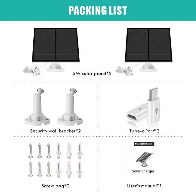 The 5v solar panel is equipped with a Micro USB port and USB Type-C adapter to provide stable and efficient power source for rechargeable surveillance cameras.