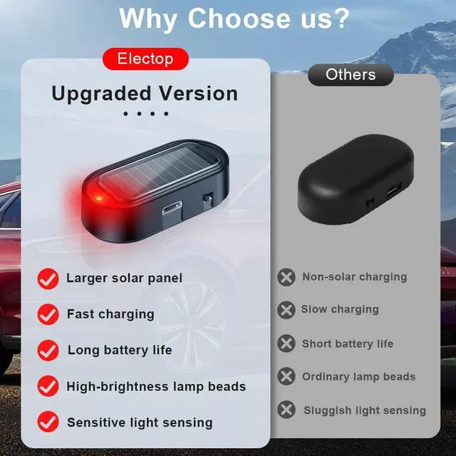 The ELECTOP Car Solar Powered Simulated False Alarm is designed to provide an extra layerof protection for vehicle owners.