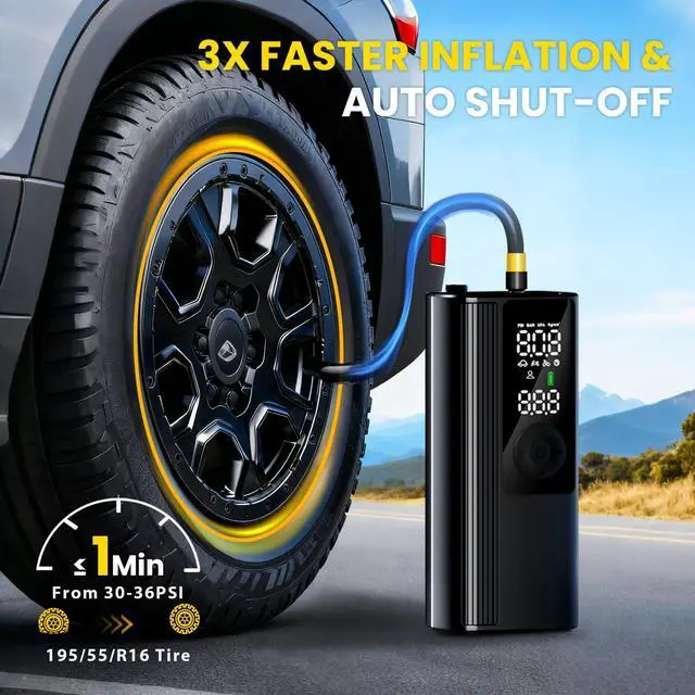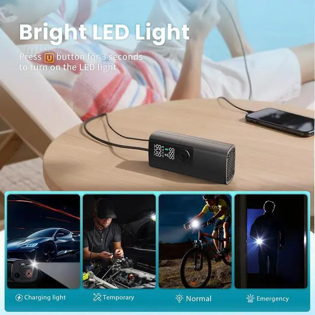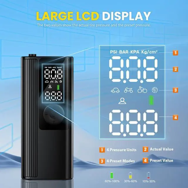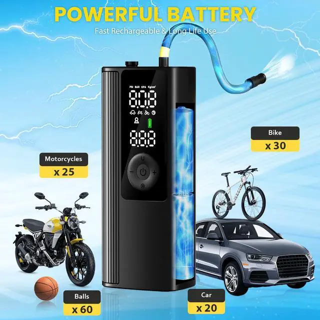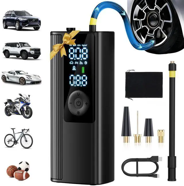 *Portable Cordless Tire Inflator X 1 *Built-in Air Hose X 1 *Type-C Charging Cable X 1 *Storage Bag X 1 *User Manual X 1 *Connecting nozzle x 4: 1 x Presta Adapter 1 x Needle Adapter 2 x Universal Nozzle Cone
