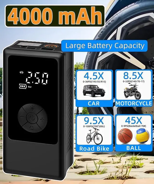 A: Yes, it’s equipped with a 4000 mAh rechargeable battery that can handle up to 5 car tires, 8 motorcycle tires, 12 bicycle tires, or 40 sports balls on a single charge.