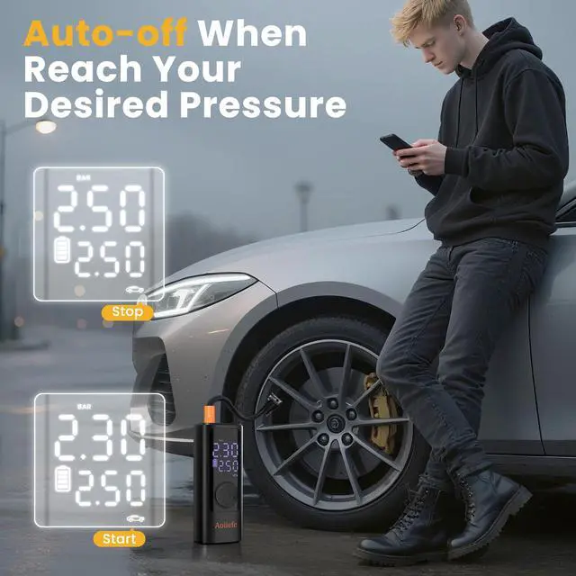 Digital Precision & Auto-Shutoff Features a clear digital PSI gauge and preset pressure settings. Automatically stops at your desired pressure to prevent over-inflation, ensuring safety and accuracy.