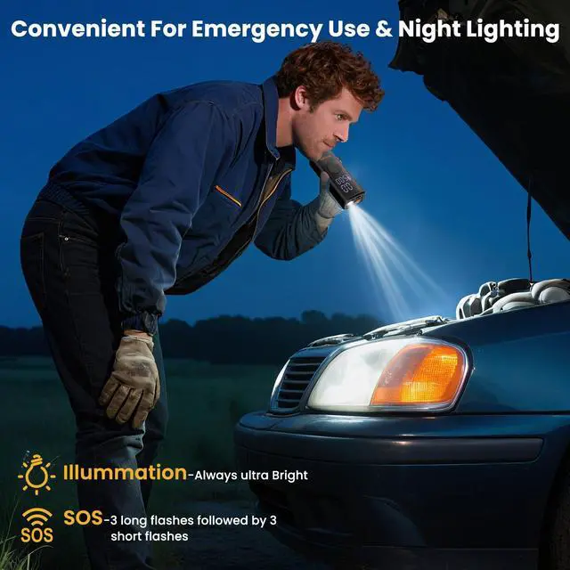 Dual LED Lights for Emergencies Equipped with a bright LED work light for nighttime repairs and an emergency flashlight with strobe modes, making it ideal for roadside emergencies and outdoor adventures.