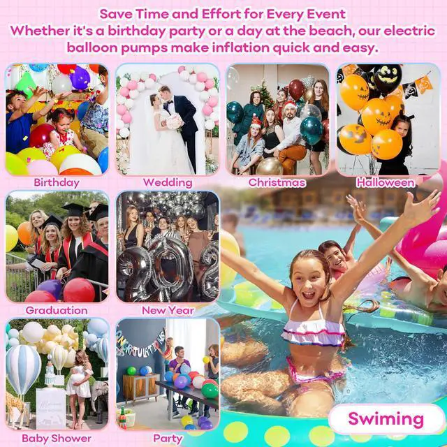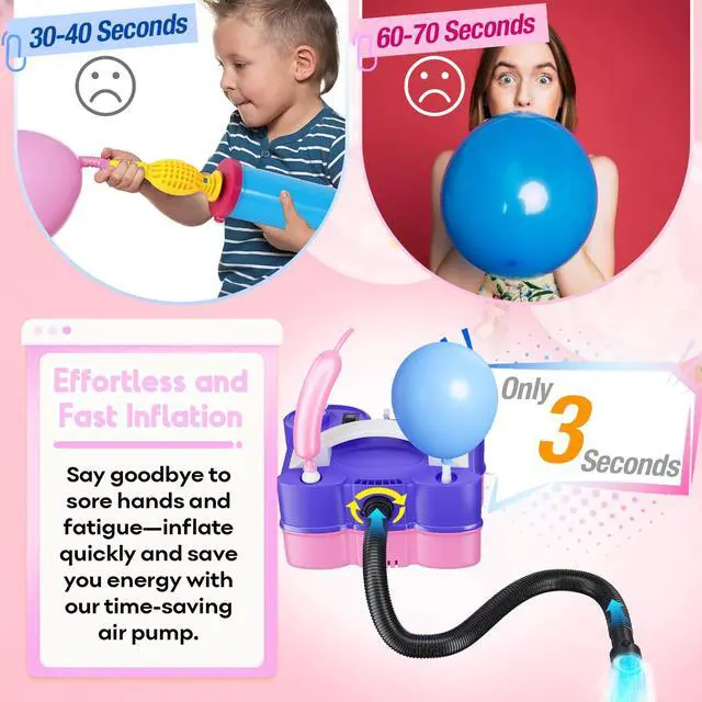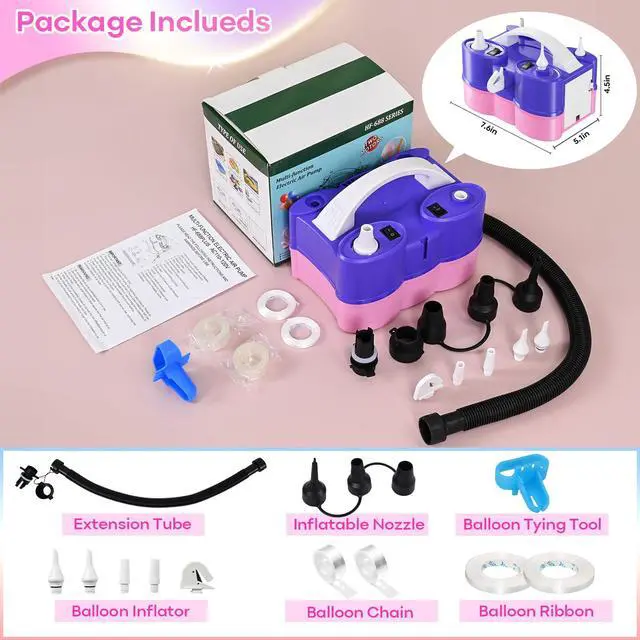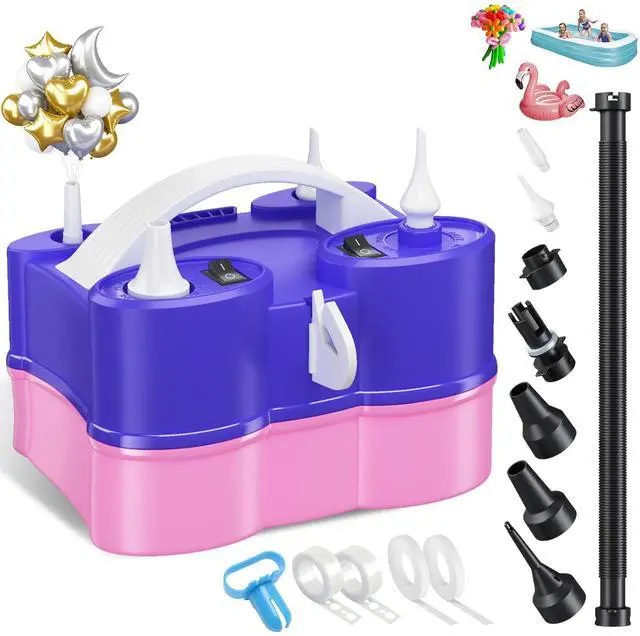 -Fast Inflation with Flexible Reach: With two powerful motors and five nozzles, this blower pump inflates balloons and various inflatables in seconds. The extension hose adds flexibility for reaching hard-to-access areas with ease.