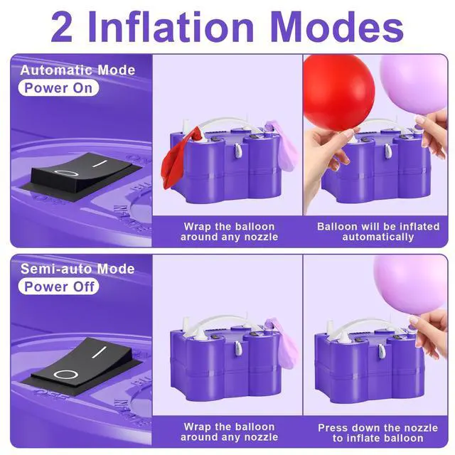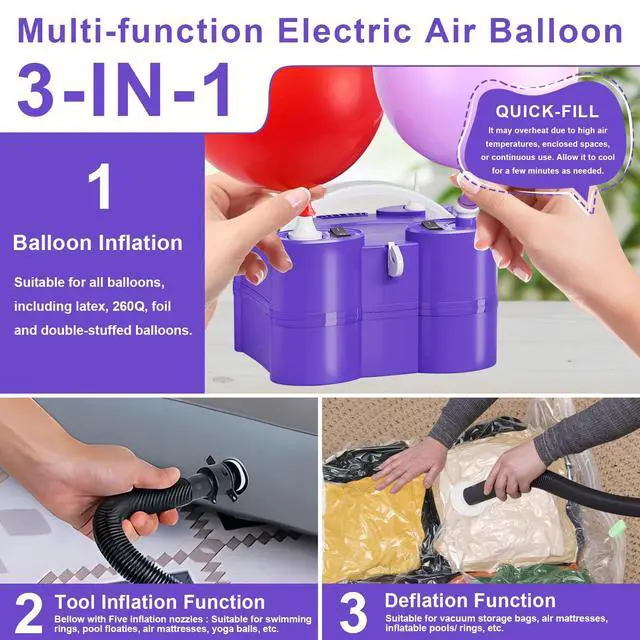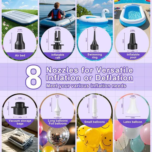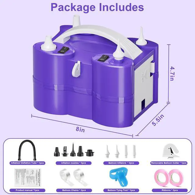 Electric Balloon Pump Package Includes 8 Detachable Nozzles for Various Uses You will get 1pcs electric air pump with dual inflation ports and deflation port, 1pcs product manual, 1pcs balloon tying tool, 1pcs built-in removable balloon cutter, 2pcs flat nozzles for long balloons and foil balloons, 2pcs small nozzles for round balloons, 1pcs long bellow tube, 5 nozzles for inflating and deflating, 2pcs ribbons, 2pcs balloon chains. IMPORTANT: 1. The input voltage must be AC110V-120V. 2. Do not continuously use this air pump for more than 2 hours when inflating the ball. Use the inflatable boat, inflatable pool, inflatable bed, or vacuum bag for no more than 20 minutes, otherwise, the air pump may be damaged due to overheating. 3. It may overheat due to high air temperatures, enclosed spaces, or continuous use. Allow it to cool for a few minutes as needed. 4. It is forbidden to block the air pump's air charging port and air inlet and keep the ventilation smooth at all times. 5. Keep this air pump away from children. WARNING: 1. Do not leave the air pump unattended when it is in use. 2. Do not use or store in a humid environment. 3. Do not breathe sand, small stones, or other objects into the air inlet or inlet at any time. 4. When the air pump is working, please do not look into the inflatable mouth or aim the inflatable mouth at the human body and face. 5. Do not attempt to put your hand or finger into the inflatable or air inlet.