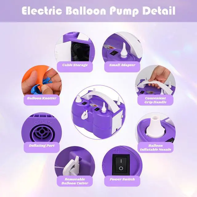 Package Included: 1 x 3-in1 balloon pump, 1 x balloon cutting, 1 x balloon ties, 2 x small balloon nozzle, 2 x balloon nozzles, 1 x extension hose with 5 nozzles, 1 x user manual