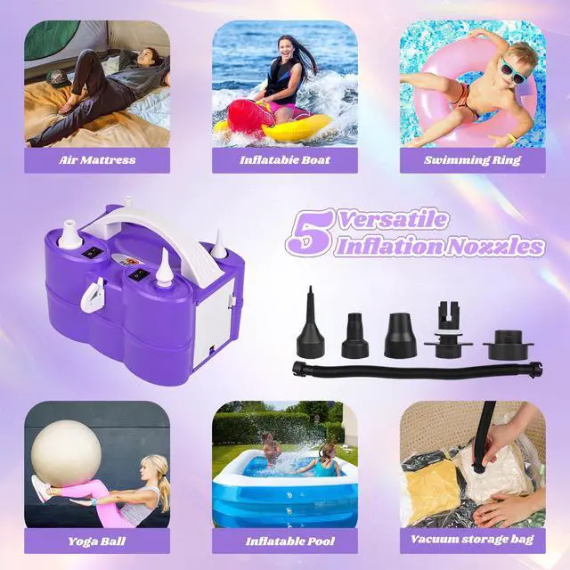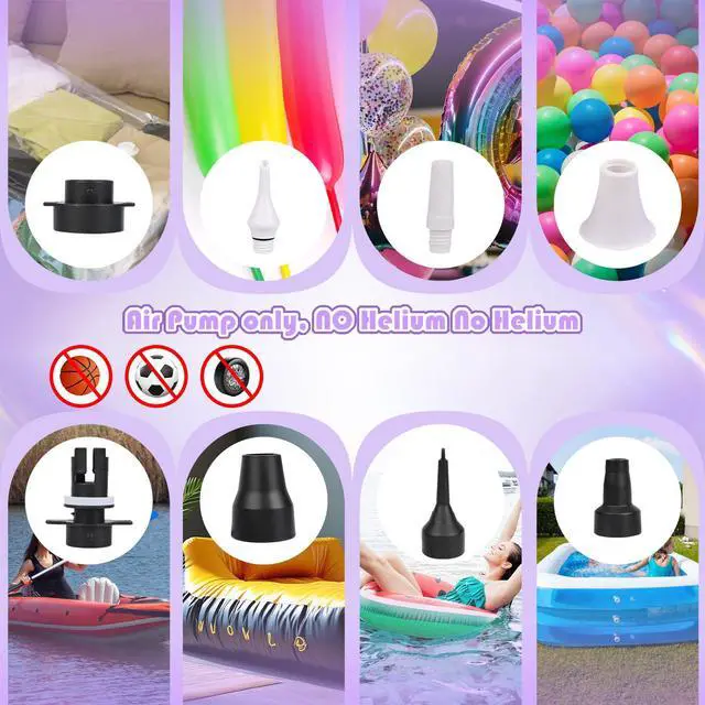 Versatile nozzle attachments: balloon blower machine is included multiple nozzle attachment to accommodate different balloon sizes and types. It is easy to inflate latex balloons, foil balloon, long magic balloon, inflatable pool, swimming ring, yoga ball, air mattresses bed, airbeds. It also can be used for vacuum bags.
