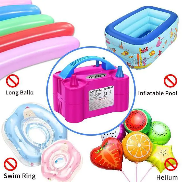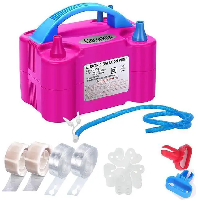 The Growsun Electric Balloon Pump is a portable and convenient solution for inflating balloons for your next party or event. Weighing only 1.6 pounds, it can be easily transported to any location. The automatic and manual double nozzle allows for faster and easier inflation, enabling you to blow two balloons at once. This air blower inflator comes with a gift box that includes an electric balloon air pump, dot glues, tape strips, tying tools, an extend tool, and flower clips. Safety warnings include keeping the machine away from children under 3 years old and not letting the machine work unattended. Please note that this item is an air pump and not a helium tank. The product dimensions are 6.3 x 4.2 x 4.5 inches, making it compact and easy to store. Follow care instructions to ensure the longevity of the product.