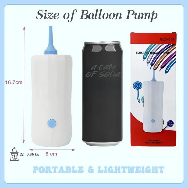 - Measures only 2.68×2.68×6.14 inches and weighs 0.66lblight enough to fit in your backpack, tote bag, or event kit. Take it to parties, outdoor weddings, or school events, and start inflating right away!