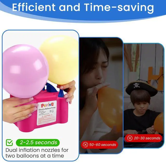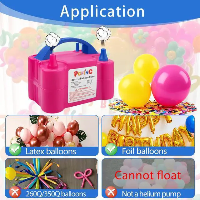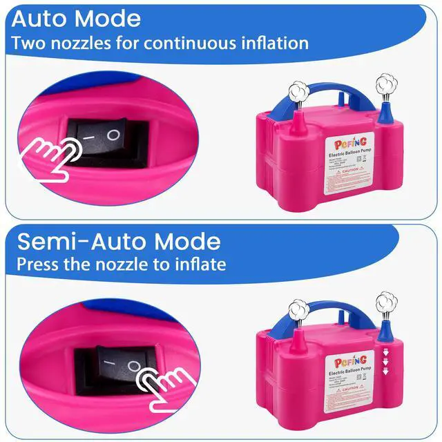 CREATE A WARM ATMOSPHERE FOR THE PARTY AND ENJOY THE NICE TIME.This Electric Balloon Air Pump Inflator has Advanced Wire storage (when not use, you can store the wire to avoid to be damaged) and Automatic protection device, when the pump unattended too long time, the pump will automatically disconnect the power supply.The best suitable for advertising balloons promotional activities and balloon decoration and festive scene layout, the inflation rate is fast, simple and flexible operation, switch control inflation, classified as continuous and touch-on two patterns, the appearance of lightweight, portable design.This electric balloon pump is designed with two operation modes, one automatic and one semi-automatic. Please choose the right mode for different balloons. If automatic mode is too fast, then please choose semi-automatic(press-on) mode, which will avoid blowing balloons burst. When using semi-automatic mode, just simply plug in the pump, leave power switch to "off" position and press the nozzle to inflate. If stop pressing, inflation will stop as well.Please be aware that this product will only fill the balloons with air, not helium or hydrogen.Choose this and create a warm atmosphere for the party and enjoy the nice time.