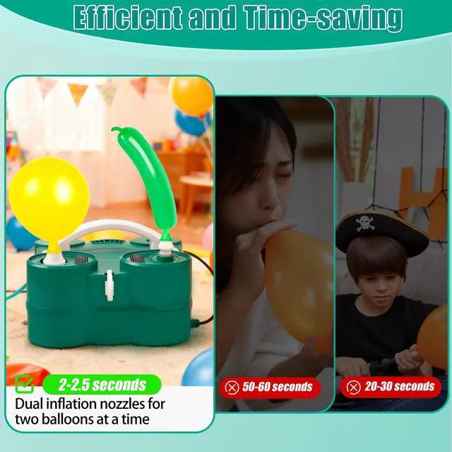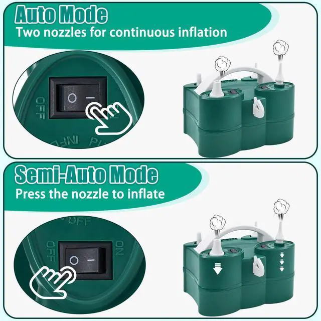 [For All Balloons] The electric air pump has two independent motors, allowing each of the two inflation ports to operate at different pressures and airflows. One of the inflation ports is used for latex and foil balloons, another can be used for 260Q, 350Q, double-stuffed, and small-size balloons.