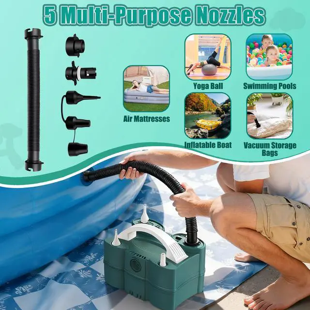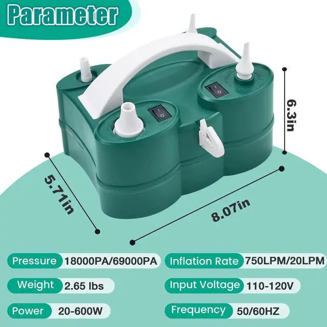 [Efficient] Pressure: 18000pa/69000pa; Inflation Rate: 750LPM/20LPM. Inflates two balloons in 2s, shrinks the vacuum storage bag in 30s, inflates the pool in 5mins.