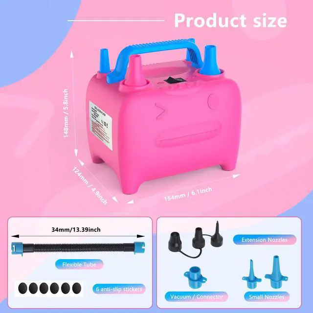 Fast Inflation: With 2 inflating ports and 2 additional small nozzles, this 600W electric air balloon pump inflates two balloons at the same time. The nozzles easily handle various latex balloon sizes, with the small nozzle ideal for smaller balloons, not long balloons