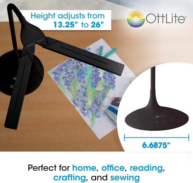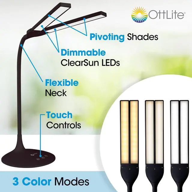 With a dual head design that pivots to 180 degrees (or anything in between), the OttLite Pivot LED Desk Lamp is the perfect computer or reading lamp. OttLites exclusive ClearSun LED formulation is as close to the sun as you can get, which means reduced glare and eyestrain and increased comfort and focus. Dimmable brightness levels and 3 color modes allow for perfectly customized lighting. Theres also a 40-minute shut off timer.