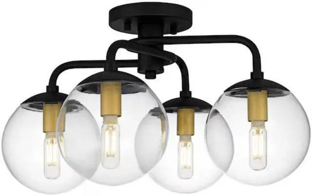 Transform your space with this stylish 4-light matte black and gold semi-flush mount light. The clear glass globe shades offer a contemporary aesthetic, allowing the bulbs to shine brightly and evenly. The bold matte black and gold finishes create a sophisticated contrast, perfect for modern and transitional interiors. Ideal for illuminating dining rooms, kitchens, or living areas, this fixture blends elegance with practicality. Simple to install, this semi-flush mount light effortlessly elevates the look and feel of any room.