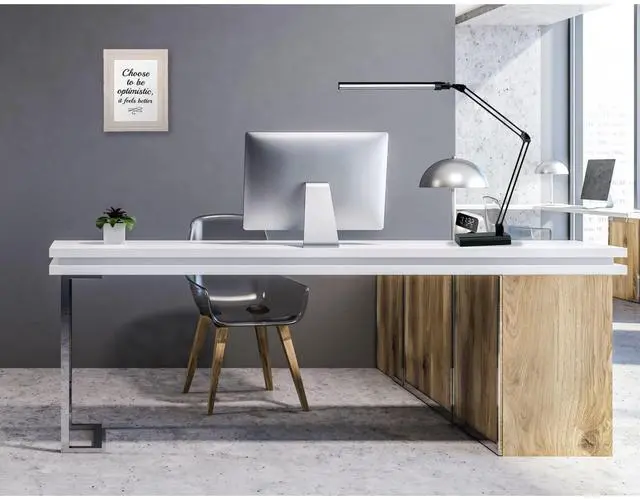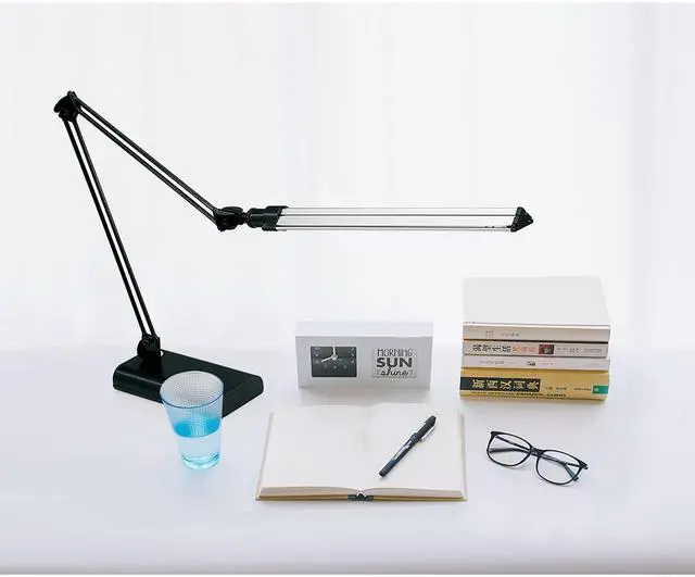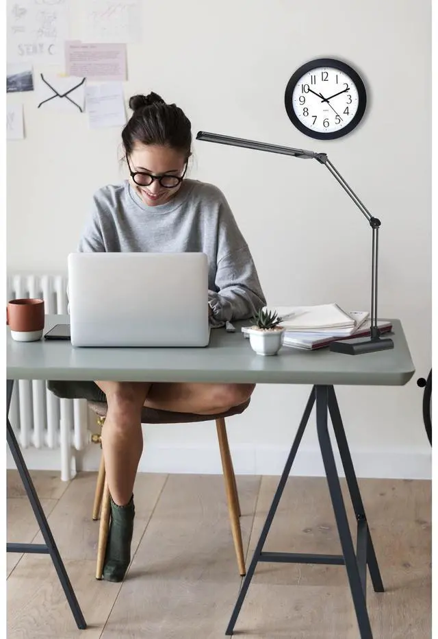 Examine the minute details of a plan or blueprint with this black and silver Realspace architect desk lamp. The adjustable height and shade let you focus the light where you need it most, while the sturdy plastic base and shade offer durability. Accentuate your workspace with the modern profile and black and silver finish. This Realspace architect desk lamp features a 3.6W LED bulb for bright illumination and a 70-inch cord for flexibility. Black slim plastic base offers a small footprint. Long plastic shade delivers modern appeal. Includes 3.6W LED bulb. Architect lamp enhances the lighting on your desk. Adjustable height allows easy customization. Green rating based on energy efficient light bulb. Eco-conscious choice - has one or more meaningful eco-attributes or eco-labels. Energy efficient - designed to use less energy than alternative products, potentially helping you save money and reduce your carbon footprint.