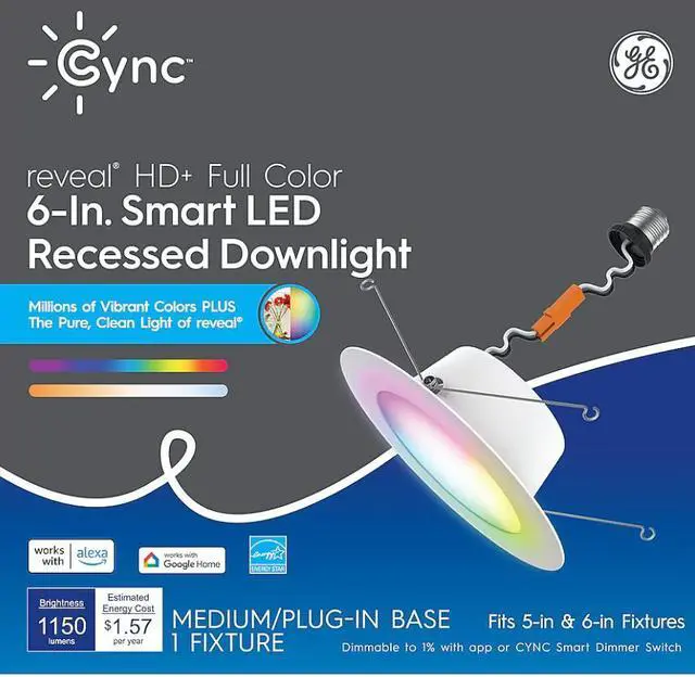 Cync reveal Recessed Downlights transform traditional recessed can fixtures from outdated to sleek and convenient featuring millions of colors and adjustable white tones, including the exceptional clarity of reveal® light. The low-profile design seamlessly blends into ceilings. Installs like a light bulb and easily connects to the Cync App, Cync reveal Recessed Downlights combine high quality of light and high brightness with the convenience of smart home control.