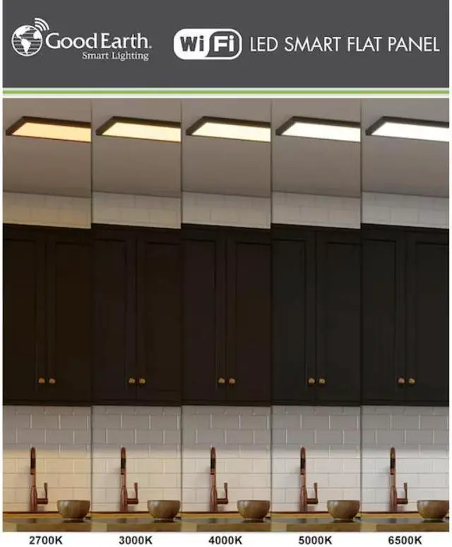 Good Earth Lighting 4-ft LED Smart Wi-Fi Flat Panel ceiling light is a low-profile design with a matte black finish that will enhance any room decor. Control Good Earth Smart lights throughout your home with an easy 3-step setup from our free Good Earth Lighting app. Control your lights anywhere from your smart phone: turn lights on/off, adjust dimming/brightness, change from warm white to cool white, and set schedules, timers, and more. Theres no need to go to the switch to adjust your home lights. Hands-free voice control works with Amazon Alexa and Google Assistant.