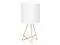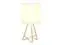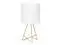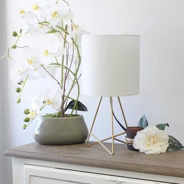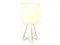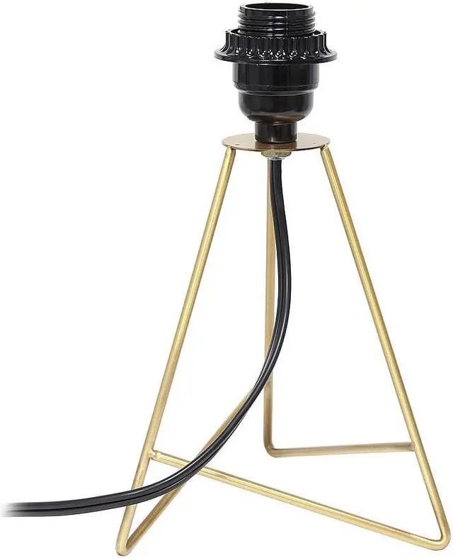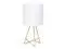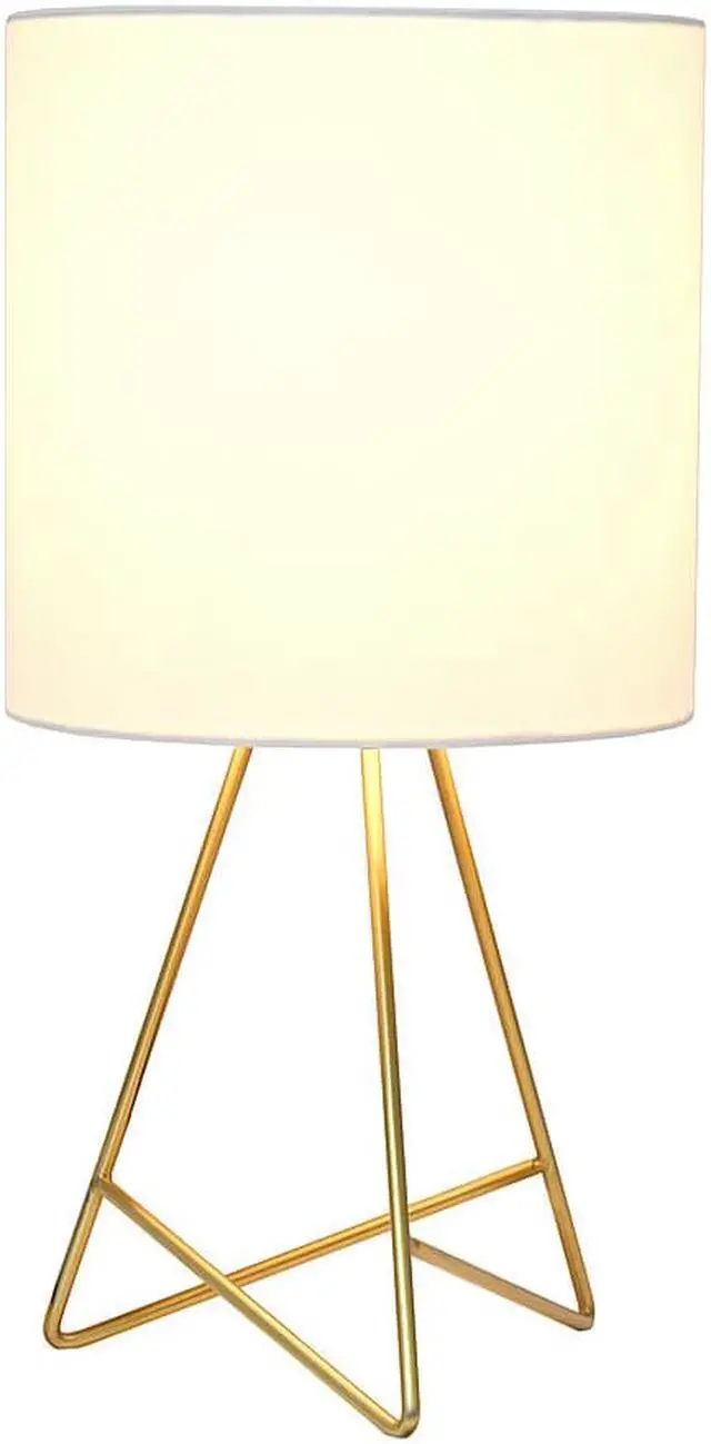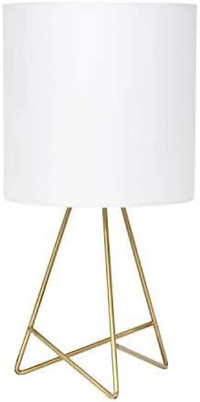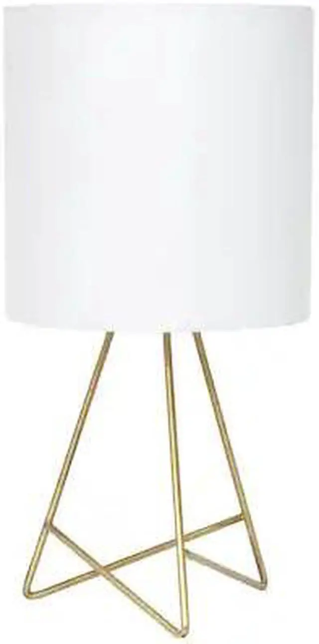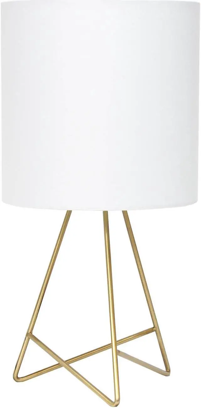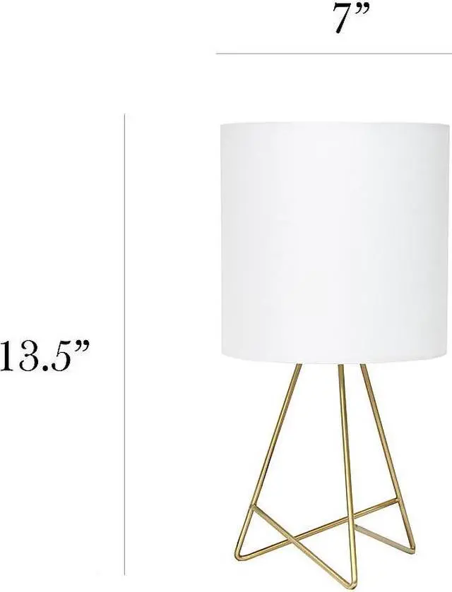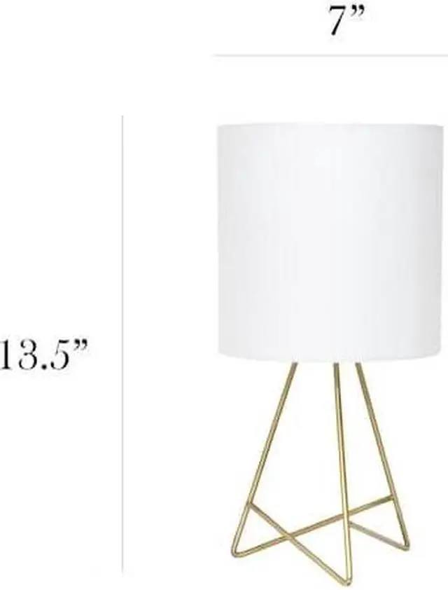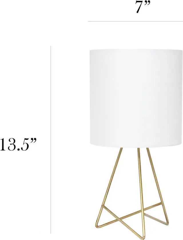 Bring function and fashion to any tabletop in your home with this modern table lamp. The gold metal base showcases an open silhouette complimented by a white fabric drum shade. Perfect size for any room in your home ! Illuminate your living room, bedroom, kids and teen rooms, college dorm, apartment, nursery, or offices with this modern table lamp with contemporary flair! Material Breakdown: METAL 70%, PLASTIC 28%, FABRIC 2%, Lamp measures Dia: 7 x H: 13.50, Shade Bottom Opening: 7. Shade Height/Slant: 7. Shade Security: Socket Nut.Shade Shape: Drum.