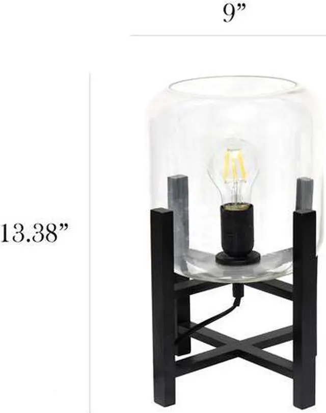 This contemporary lamp elevates the glass shade on a four-arm wood stand finished in black. The curvy cylindrical clear glass shade combined with the geometric wood base creates the perfect ensemble. Place on a desk, nightstand, dresser or table for a modest, refined look in fashion lighting.**HELPFUL TIP: To get the complete vintage look, we recommend using a decorative Edison/Vintage bulb (not included). **