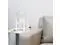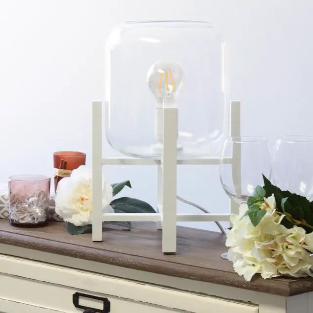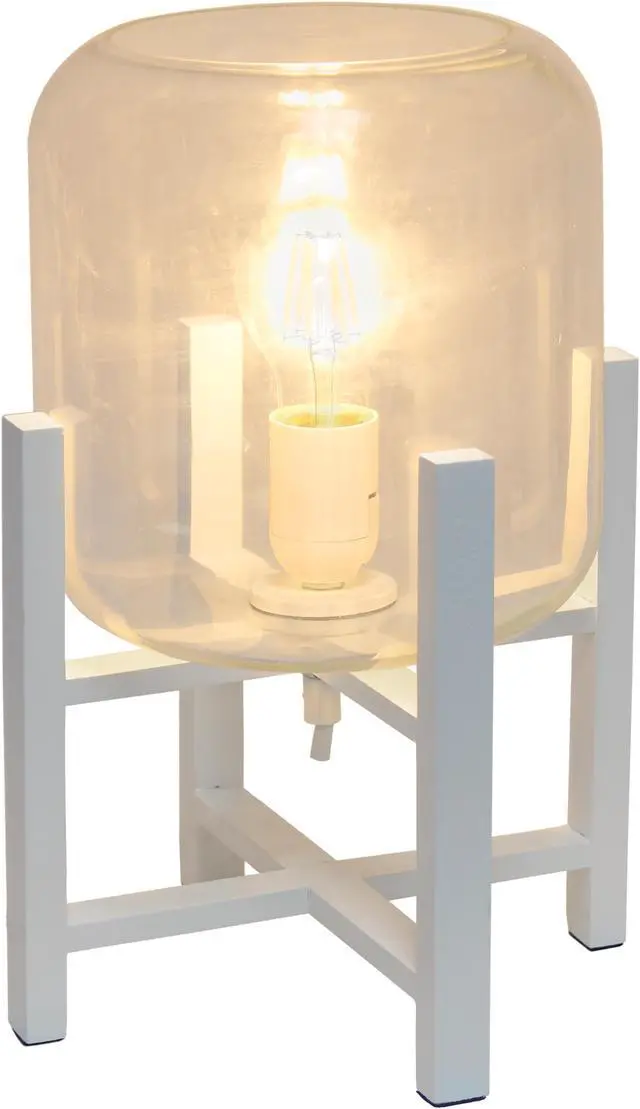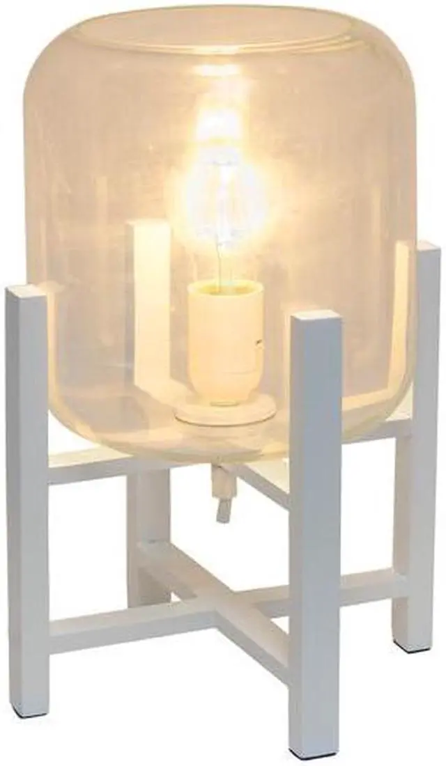 This contemporary lamp elevates the glass shade on a four-arm wood stand finished in white. The curvy cylindrical clear glass shade combined with the geometric wood base creates the perfect ensemble. Place on a desk, nightstand, dresser or table for a modest, refined look in fashion lighting.**HELPFUL TIP: To get the complete vintage look, we recommend using a decorative Edison/Vintage bulb (not included). **