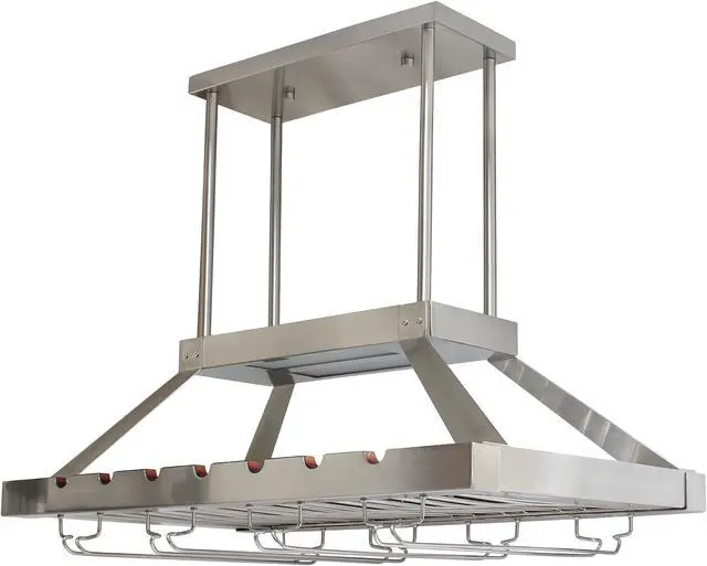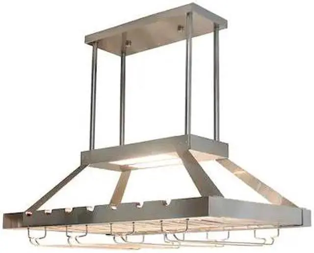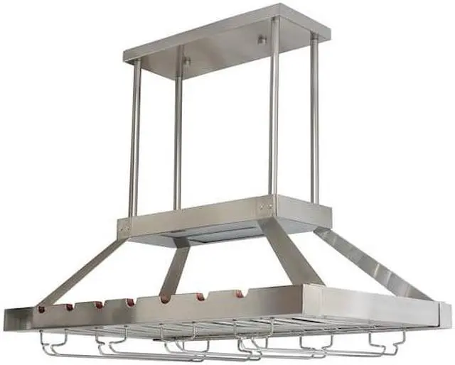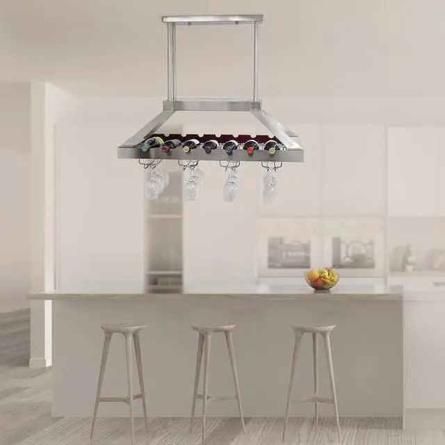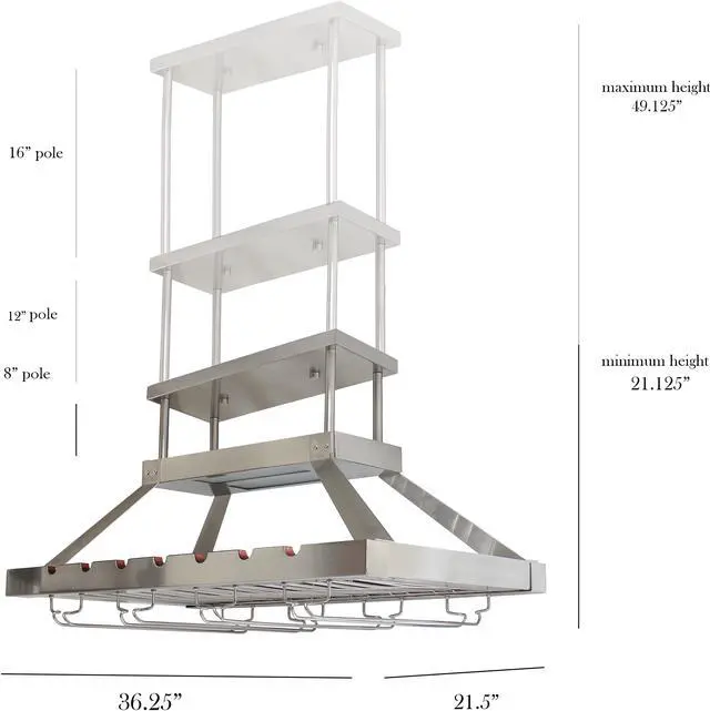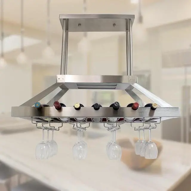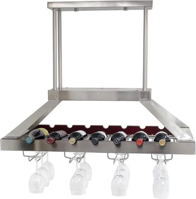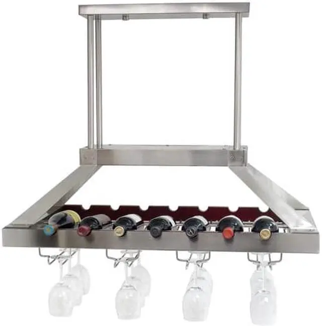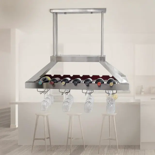 Instead of displaying your variety of wine selections the old fashioned way, why not make the upgrade to this beautiful overhead metal wine rack? Equipped to hold a combination of 14 standard wine bottles and 16 stemmed wine glasses, it serves both a functional and style purpose for your space. This product comes with a total of 12 poles that are suited to adjust the height of the wine rack to adapt to both tall and low ceilings.