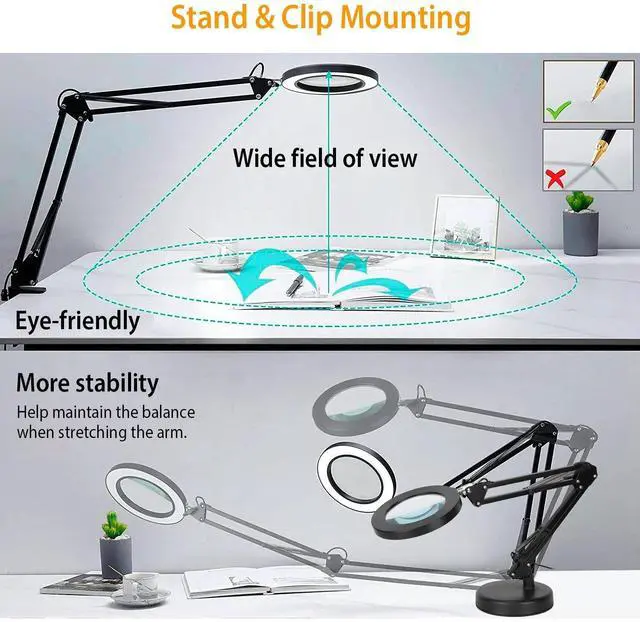 Two Mounting Choices:Two mounting choices allow for attachment on any work surface. You can attach it to the desk with the included clamp or just let it stand on the desk with by inserting into the stand. Besides,the large heavy stand helps keep the lamp in place when stretching the arm.