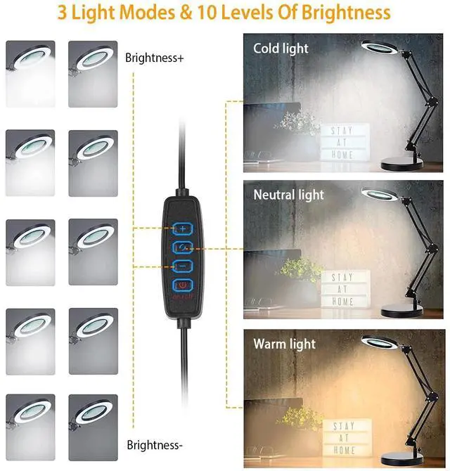 3 Light Modes & 10 Brightness:Create multiple lighting effects by choosing from 3light modes(cold/warm/neutral) and 10 adjustable brightness. Just press the brightness and light mode switch on the adapter to set the perfect light for your work,such as models,puzzles,painting,embroidery,sculpting,tattoo,and etc..