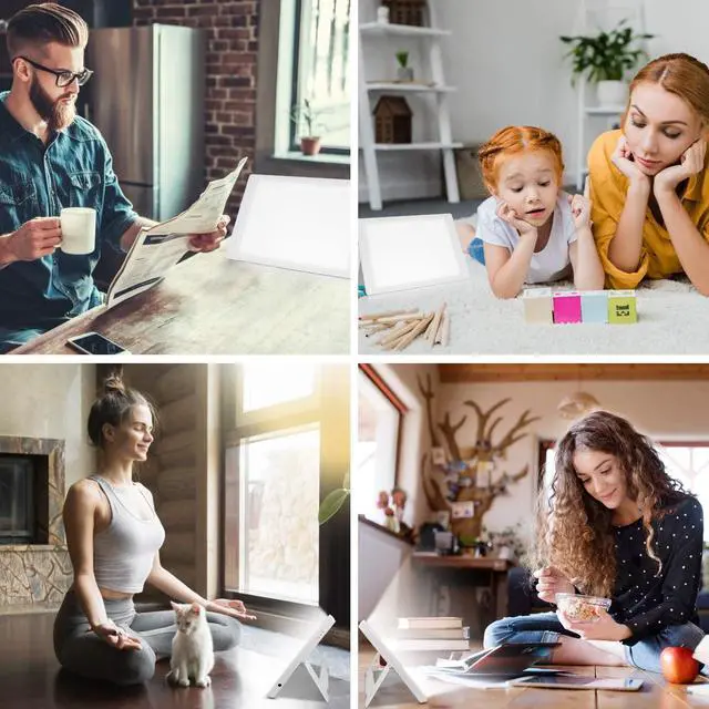Place the light therapy light 5.5-24 inches away from your face on the desk and set the best angle with the bracket that makes sure you are exposed to the light. The eyes must be open but don't look directly at the lamp.