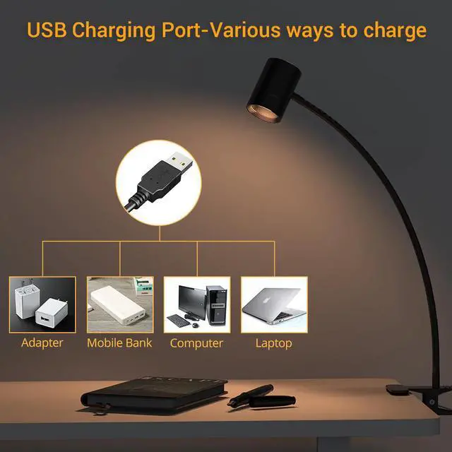USB Charging PortYou can power the clamp desk lamp by USB Port, easy to plug into any available USB port to power the lamp, such laptop, computer, power bank. We provide you with various types of power adapters, which you can purchase according to your needs.