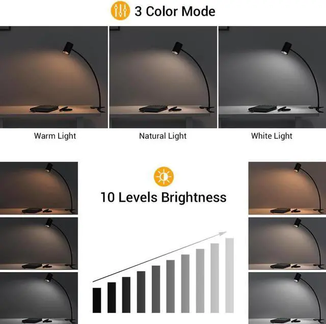 3 Color Mode & 10 Levels BrightnessThis practical clamp desk lamp feature with 3 kinds Color Mode:warm light,natrual light and white light, each modes have 10 levels Brightness, so that it create 30 illumination modes, meet all your requirements.