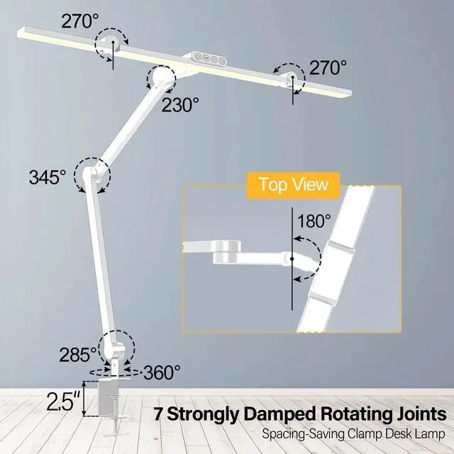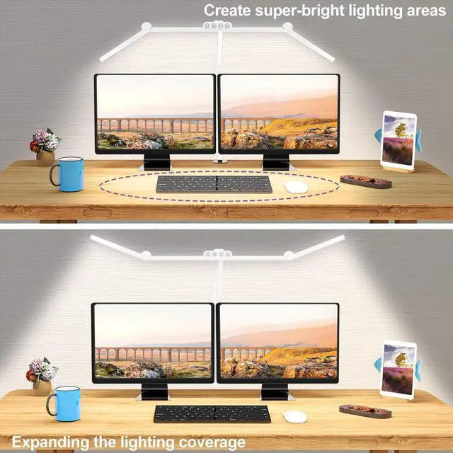 24W table lamp is equipped with high color rendering index LEDs(CRI>90) to generate soft flicker-free and anti-glare light and accurately render colors, close to the natural light and less blue light hazard. You won't get tired with prolonged use. You can also rotate the left auxiliary light down for eliminating shadows.