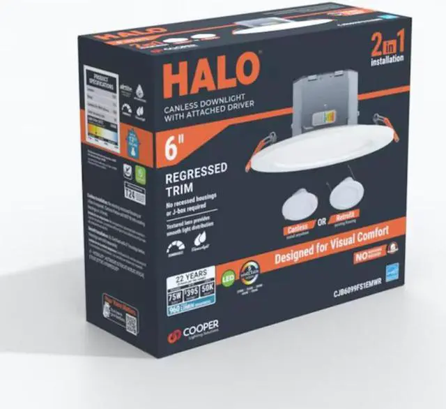 Halo simplifies your installation with this 2-in-1 slim downlight. The canless downlight with attached JBOX makes wiring and mountin a breeze. The JBox is attached so no need for additional components, this canless recessed downlight is designed for use in new construction, remodel and retrofit installations. Choose your color temperature directly on the fixture. With the flick of a switch, you can choose between 5 color temperatures ranging from warm (2700K) to daylight (5000K) prior to installing into your ceiling. This Halo recessed lighting fixture features an LED driver that offers 120-Volt dimming capability.