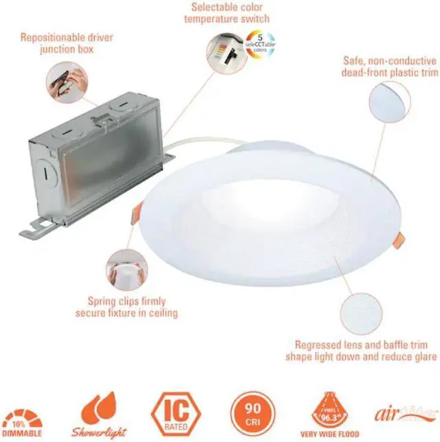 HALO LT canless regressed LED downlights are recessed lights designed for use in new construction, remodel and retrofit installation, without the use of a housing or junction box. The regressed lens and baffle trim provides glare reduction. Choose your color temperature directly on the fixture. With the flick of a switch, you can choose between 5 color temperatures ranging from warm (2700K) to daylight (5000K) for ultimate flexibility.