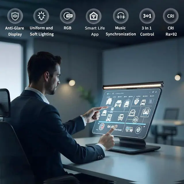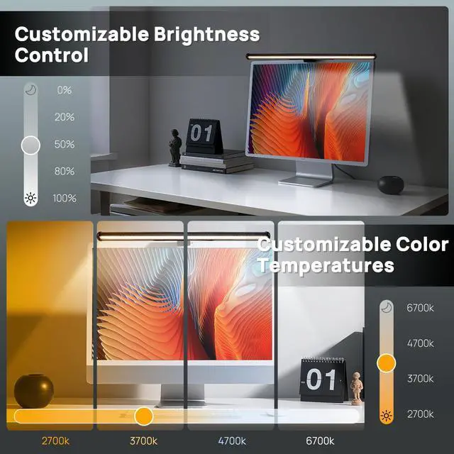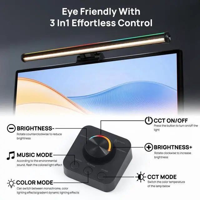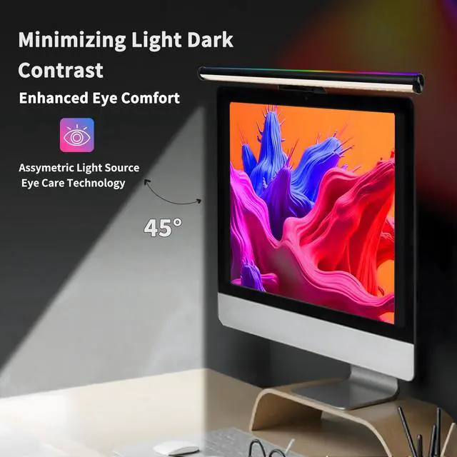 Whether you're working late, reading, studying, or gaming, this monitor light bar is a must-have. Its asymmetrical optical design illuminates your desk without reflecting on your screen, providing balanced, shadow-free lighting. With adjustable color temperatures (2700K6700K), 100 brightness levels, and 15 RGB ambient modes, it's ideal for any mood or task.